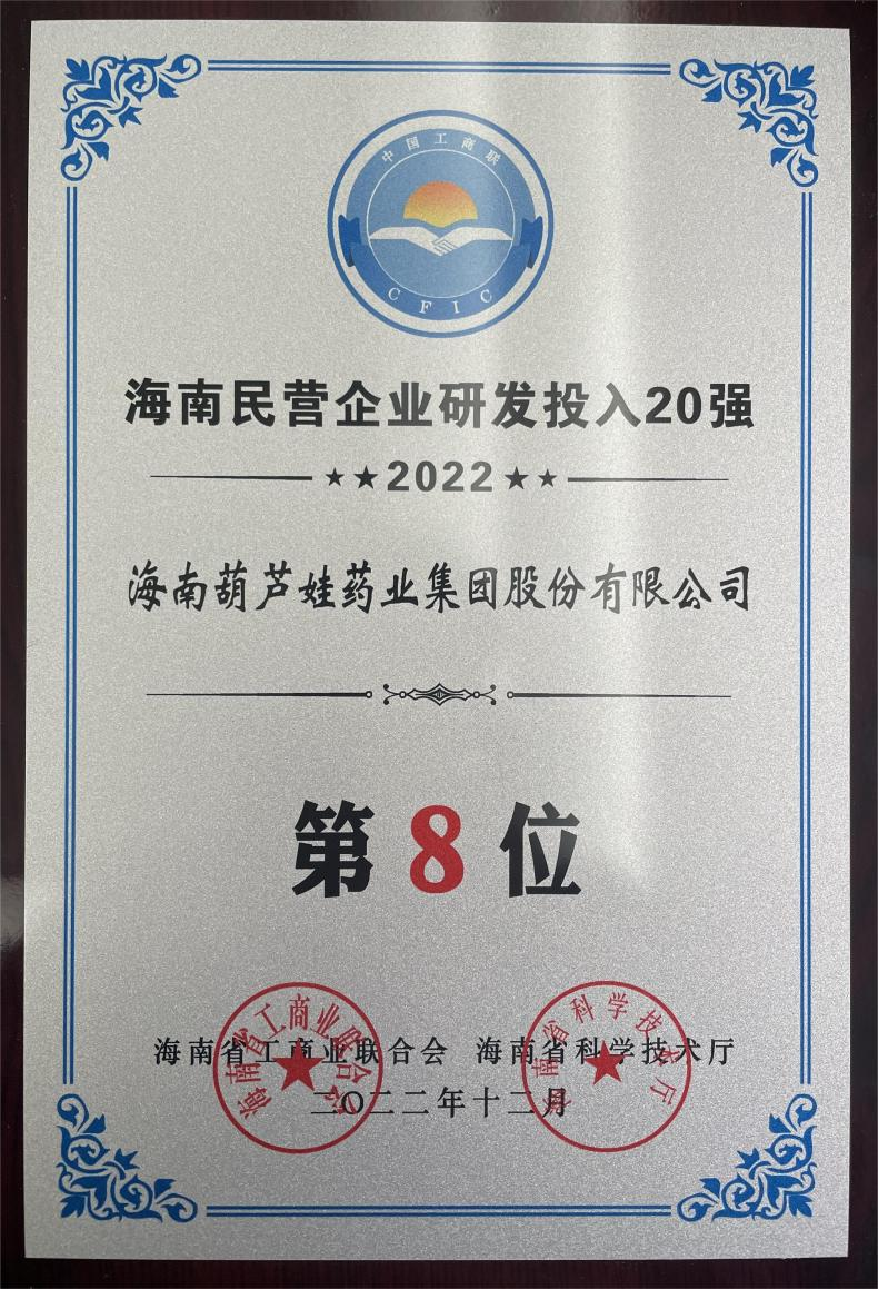 12月23日,2022海南民营企业50强和研发投入20强发布会在海口举行。会上发布了“2022海南民营企业50强”“2022海南民营企业研发投入20强”榜单和分析报告。97国际药业再次荣登两榜,在海南民营企业50强榜单中位列第25位,较去年上升8位,这也是公司连续三年登榜;在海南民营企业研发投入20强中位列第8位,较去年上升7位。