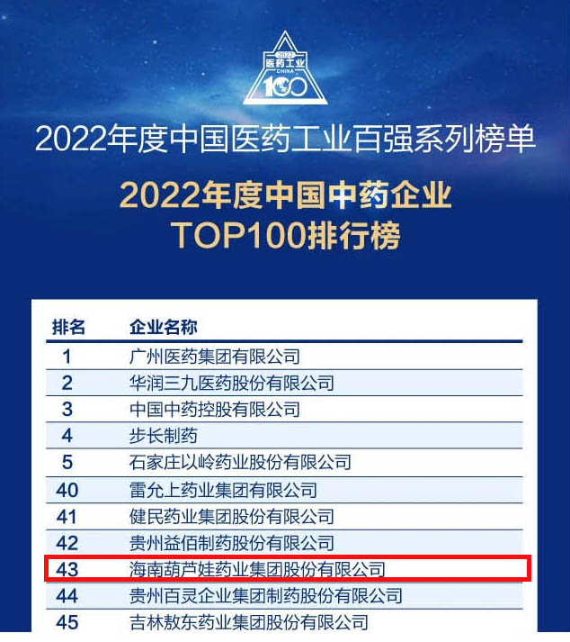会议期间,一年一度的中国医药工业百强系列榜单隆重揭晓,97国际药业集团凭借领先的研发优势和扎实的生产实力以及稳健的市场推广能力,连续第四年成功入选“2022年度中国中药企业TOP100排行榜” ,排名稳步上升至第43位。